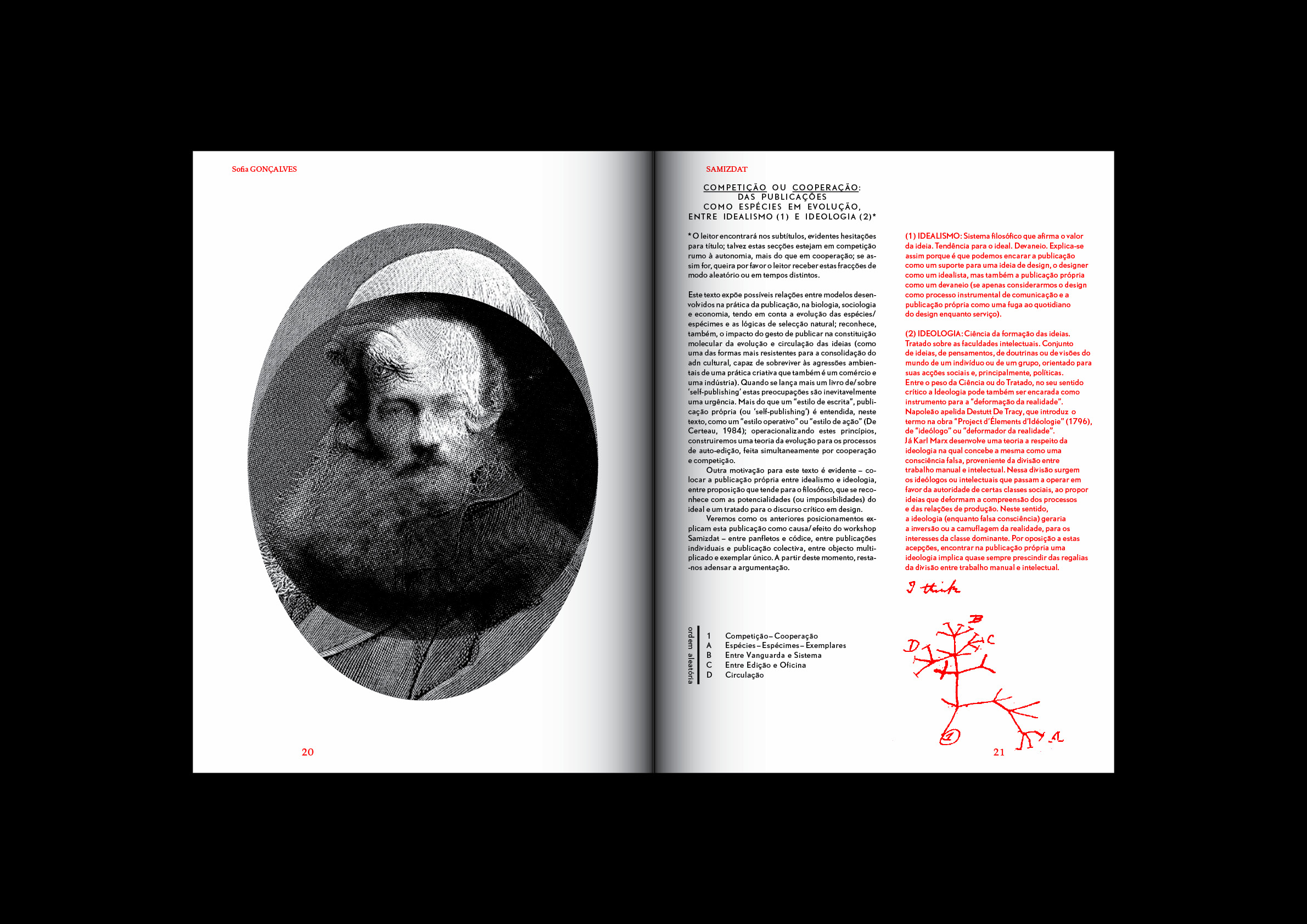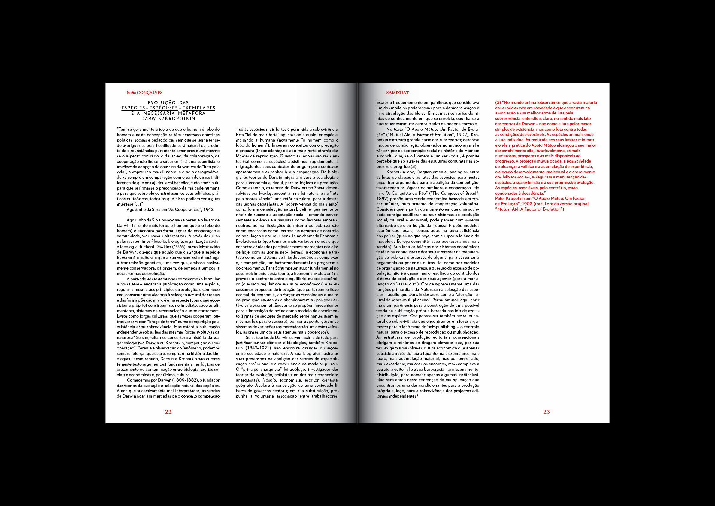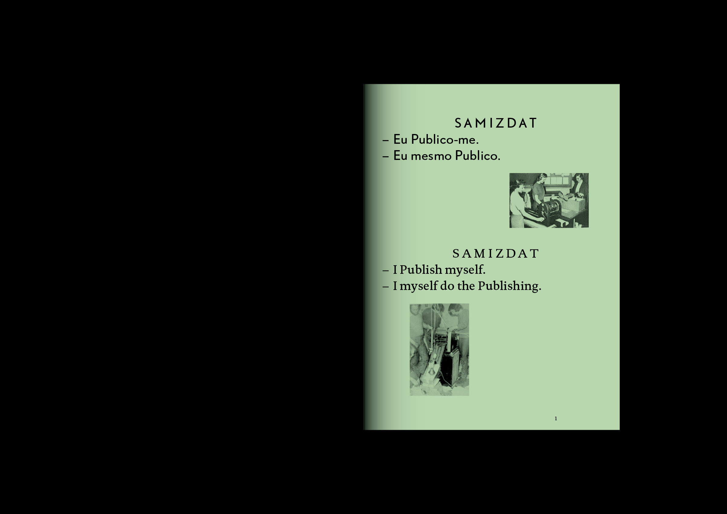 O workshop e a publicação Samizdat partiram destes pressupostos; foram ainda o alibi para reunir um conjunto de pessoas com interesses comuns em torno da publicação própria e dos seguintes temas: ideologia(s), práticas artísticas/publicação, edição/conteúdos, cultura impressa/cultura digital, meta-media, produção, distribuição/público/leitor. Do diálogo e da reflexão surgiram publicações próprias e um Reader que, para além de apresentarem sugestivas experimentações formais e conceptuais, se assumiram como massa crítica em torno deste tema.